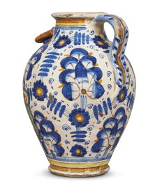 in maiolica dipinta in policromia, corpo piriforme, ansa a nastro, cannello raccordato al corpo con un sottile cordoncino. Decoro “alla palmetta” sull’intera superficie, interrotto sul fronte dal cartiglio con l’iscrizione farmaceutica: SY.[O] D.[I ]NENUF.[E].R.[O]; alt. cm 24, diam. bocca cm 8,3, diam. base cm 9,2