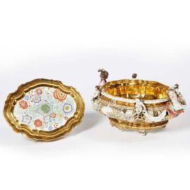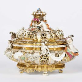 di forma ovale in porcellana policroma e dorata, realizzata secondo il servizio Krönung; coperchio sormontato da una corona sorretta da putti tra quattro cartigli, dei quali i più grandi sono dipinti con gli stemmi degli Elettori di Polonia e Sassonia, mentre sugli altri due sono raffigurate scene di caccia; sul corpo putti a tutto tondo che sorreggono drappi si alternano a riserve dipinte con scene paesaggistiche; le anse sono modellate in forma di busti di fanciulle abbigliate alla moda; interno del coperchio decorato in policromia a motivi floreali; piedini a ricciolo, cm 19x25,2x18