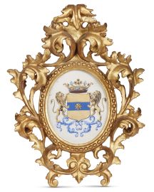 in legno intagliato e dorato di forma ovale, battuta liscia su controbattuta dentellata alla quale si applica la fascia scolpita a giorno a motivo di volute fogliacee che dal centro inferiore si portano in alto a creare la cimasa a volute divergenti coronate da foglia di acanto; ingombro cm 33x25, luce cm 13,5x11