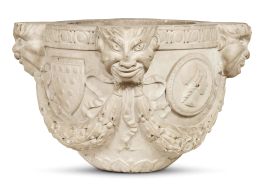 in marmo, bordo ornato a motivo di ovoli ricorrenti entro cerchi intervallato agli angoli da mascheroni scolpiti da cui pendono festoni di foglie, due facce ornate da stemmi, una da medaglione con giglio, una da medaglione con profilo di soldato, cm 41x52x51