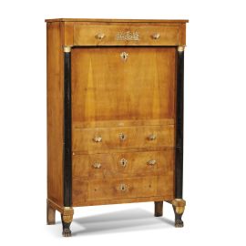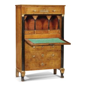 in ciliegio con dettagli ebanizzati e applicazioni in bronzo dorato, un cassetto sottopiano centrato da fregio dorato sotteso da fronte rientrante inquadrato da colonne a tutto tondo con basi e capitello in bronzo dorato, calatoia celante vano a giorno entro volta a colonnine su tre cassettini, cui seguono tre cassetti, prese in bronzo dorato in forma di farfalla e bocchette a due erme affrontate, piedi a zampa leonina, cm 161x100x50