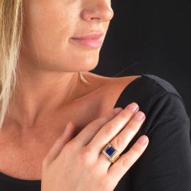 in oro giallo e bianco 18kt, al centro una pietra sintetica blu sfaccettato, affiacanta da piccoli diamanti, punzoni 750 e del fabbricante, mis. 52, gr. 15