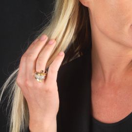 VOLUTE-SHAPED DIAMOND AND SAPPHIRE RING IN 18KT TWO TONE GOLD