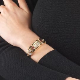 cassa di forma rettangolare in oro a basso titolo decorata con incisioni a volute, fondello a pressione, lunetta in oro basso ornata con pietre rosse, distanziali impreziositi da rombi in argento con piccoli diamanti taglio misto, anse ad elementi intrecciati ornati da volute in argento decorati a filigrana con diamanti taglio misto, quadrante argenté firmato Classic, numeri arabi oro applicati, movimento a carica manuale, bracciale in oro a basso titolo ad elementi a maglie mobili, chiusura in oro a basso titolo, vetro minerale, gr. complessivi 25. Dim. mm 19x40
