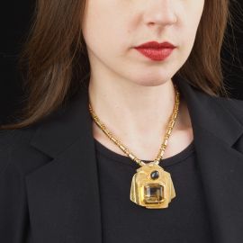 in oro giallo 18kt, composta da una catena di maglie a cilindro da cui pende un grande pendente con al centro un quarzo citrino sfaccettato, una pietra onice taglio cabochon e due diamanti taglio brillante per ct 0.10 circa, punzone 750, lungh. cm 39, gr. 94