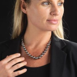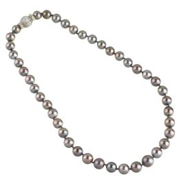 composta da un filo di perle grigie leggermente digradanti di mm 11-8 circa, fermatura a sfera in oro bianco 18kt impreziosita da diamanti taglio brillante per ct 0.90 circa, lungh. cm 48, gr. 63