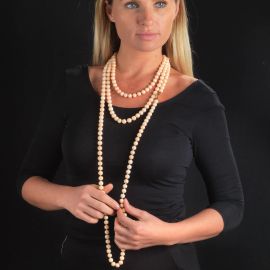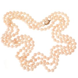 composta da una fila di sfere in corallo rosa di mm 10 circa, fermatura in oro giallo 18kt, punzone 750, lungh. cm 240, gr. 322