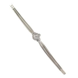 cassa in oro bianco18kt, fondello a pressione, lunetta impreziosita da fila di diamanti, anse a voluta finemente decorate a filigrana con piccoli diamanti, corona marcata, quadrante argenté firmato Bulova, indici applicati, movimento a carica manuale, bracciale integrato a maglia tessita in oro bianco con chiusura a fermaglio in oro bianco 18kt, vetro minerale, gr. 25. Diam. mm 15