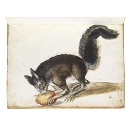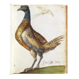 volume rilegato in pergamena decorata in oro contenente trenta tavole raffiguranti animali dipinti a mano, matita nera, pennello e inchiostro acquarellato su carta vergellata e filigranata, mm 285x215