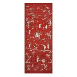 con sfondo rosso personaggi e fiori finemente ricamati.