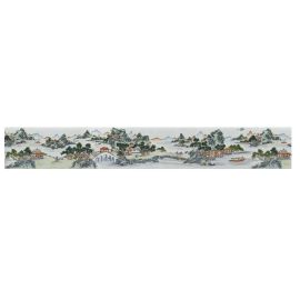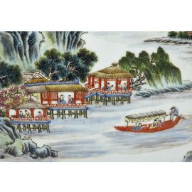 主题纹饰为通景山水楼阁图,描绘了在远山近水、亭台楼阁、水光潋滟,庭桥流水、洞石松柏花卉之间,众多的文人墨客闲庭信步其中,观景,对诗,泛舟,相协而行,一片雅致祥和。主题纹饰的上边饰粉彩如意云头纹,下边饰黄地如意方瓣纹。足上饰青花回贯折纹一周。足内施粉绿釉,署矾红篆书“大清乾隆年制”六字三行款。