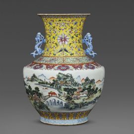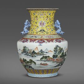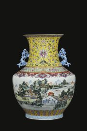 清 十九世纪 黄地通景山水楼阁图龙耳尊一对