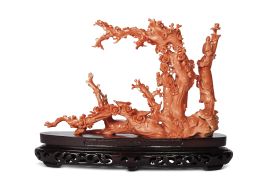 in corallo rosso raffigurante tre personaggi sopra un ponte fra rami, fiori e uccelli.