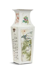 in porcellana policroma di forma squadrata con prese dorate a testa di animale decoro nello stile Qianjiang, paesaggio naturale in verticale e gruppo di persone con scritte e firma.