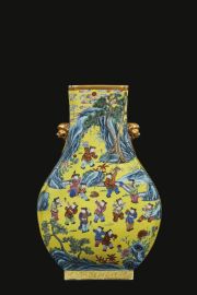 清 同治 1862至1875 黄地粉彩百子图兽耳尊