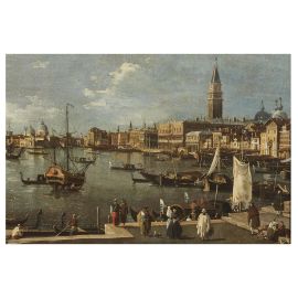 Questa straordinaria veduta panoramica di Venezia trova il suo centro nell’entrata al Canal Grande e inquadra i maggiori edifici ecclesiastici e civili che prospettano sul bacino di San Marco.