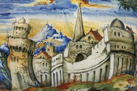 Nello specifico del nostro vaso il soldato romano e il paesaggio trovano evidenti riscontri nei piatti e nelle forme aperte prodotte dalla bottega veneziana, di cui sono noti alcuni esemplari firmati. Si veda al riguardo l’esemplare pubblicato da Johanna Lessmann, dove la roccia presente nel nostro vaso trova riscontro con l’arco del sepolcro di Gesù. Anche la figurina del cavaliere, così sottile e allungata, ha riscontro sia nei piatti di Mastro Domenico, sia nelle figurette di santi presenti nei vasi. Ancora più prossimo il paesaggio presente sul vaso da mostarda del British Museum (inv. 1852,1129.3), con elementi decorativi comuni soprattutto nelle architetture: anche se il contenitore del museo inglese mostra, a nostro parere, l’intervento della mano di un maestro differente rispetto al nostro, redatto invece con una maggiore sicurezza, a conferma di quanto proposto nella recente pubblicazione di Riccardo Perale che ha studiato proprio l’intervento in bottega di più pittori distinguendo l’opera dei maestri, e inserendo proprio l’opera in studio nella sua pubblicazione.