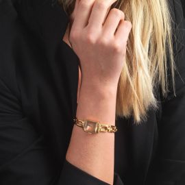 cassa di forma in oro giallo 18kt, fondello a pressione, anse scanalate, quadrante virato firmato Baume & Mercier, numeri romani, movimento a carica manuale, bracciale a maglie geometriche con chiusura a scomparsa in oro giallo 18kt, vetro ricurvo, gr. complessivi 23. Dim. mm 17x24