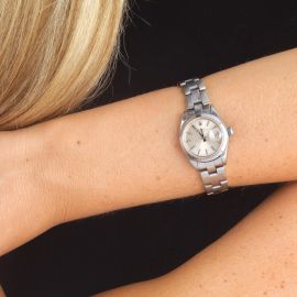 cassa in acciaio, fondello serrato a vite, corona marcata, lunetta liscia in acciaio, quadrante argenté, datario a ore tre con lente cyclope, indici applicati con trizio, movimento a carica automatica cal 2135 n. 419559, bracciale oyster in acciaio ref. 78340 finali ref. 590, chiusura a scatoletta marcata Rolex, vetro minerale. Diam. mm 26