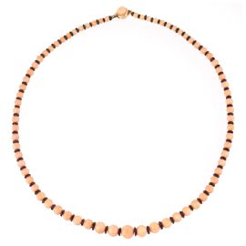 composta da una fila di sfere in corallo rosa alternate a distanziali in onice sfaccettati, fermatura in oro a basso titolo, lungh. cm 57, gr. 36