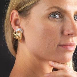in oro giallo scanalato e oro bianco 18kt, impreziositi da diamanti taglio brillante per ct 2 circa, punzoni 750 e del fabbricante, dim. cm 2,5x3,5, chiusura a clip con perno, gr. 31 complessivi