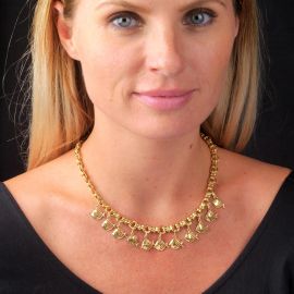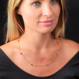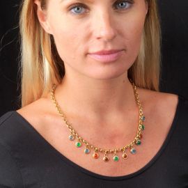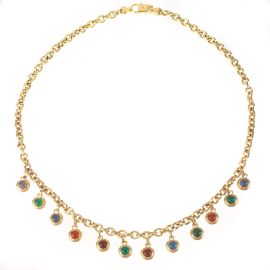 in oro giallo 18kt, di cui due con pendenti a disco e calcedoni, lungh. cm 38 e 50, una con pendenti a forma di pesce, lungh. cm 44, e un'ultima collana impreziosita da rubini taglio ovale, lungh. cm 54, punzoni 750 e del fabbricante, gr. 124 complessivi