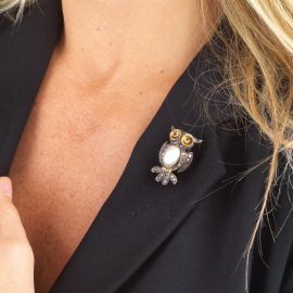 SPILLA A FORMA DI GUFO CON PERLA ZAFFIRI E DIAMANTI