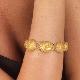 in oro giallo 18kt, composto da una serie di maglie a forma di scarabei stilizzati recanti sul fondo motivi figurati realizzati con la tecnica della granulazione, lungh. cm 20, gr. 45
