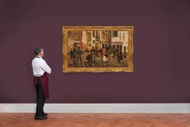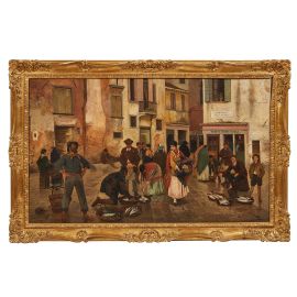 Le sue opere ritraggono scene di genere, di vita quotidiana, tradotte con un certo manierismo, come questo episodio di mercato ambientato in un campo veneziano, dove l’accuratezza del pennello e la morbidezza cromatica, d’impianto favrettiano, volgono a una scrittura e composizione di spiccato senso teatrale.