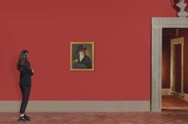 Lo sguardo rivolto curiosamente verso l’alto, l’elegante cappello da cui spuntano ordinati riccioli, la cravatta inamidata e inappuntabilmente bianca , l’ordinata cartella, ove sono racchiusi schizzi e studi, su cui si adagia la mano che impugna il pennello a identificare l’attività dell’artista, protagonista protagonista del ritratto che presentiamo in questa vendita.
