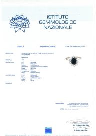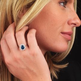 in oro bianco 18kt, al centro uno zaffiro taglio ovale di ct 2 circa, circondato da una fila di diamanti taglio brillante per ct 1 circa, colore H, purezza Vs/SI, mis. 53, gr. 4. Corredato di certificato IGN del 23/09/2022 attestante l'assenza di trattamenti termici.
