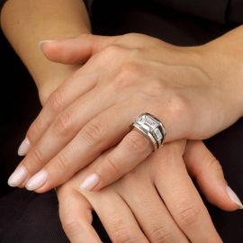 in oro bianco 18kt, recante al centro un diamante taglio ottagonale (smontato) di ct 3.89, colore E, purezza Vs1, affiancato da due diamanti taglio ottagonale (smontati) per ct 1.80, mis. 48, 13. Corredato di certificato IGN del 23/09/2022 attestante le caratteristiche della pietra centrale.