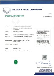 in platino, recante una giadeite con motivo floreale inciso affiancata da piccoli diamanti taglio huit huit, n. seriale 4980, mis. 54, gr. 3. Corredato di certificato FGA and DGA del 14/01/2022 attestante le caratteristiche della pietra e l'assenza di trattamenti.