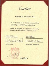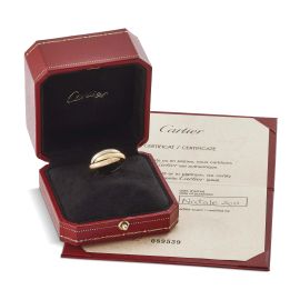 in oro tre colori, con le iconiche tre fedi unite tra loro, firmato "Cartier", punzone 750, n. SQ5277, mis. 53, gr. 8. Corredato di scatola e garanzia.