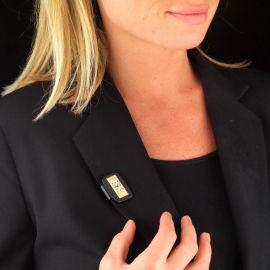 cassa di forma in oro giallo 18kt, lunetta scanalata in oro giallo, quadrante color avorio firmato Cartier France, grafica nera, numeri arabi stampati, movimento a carica manuale Jaeger, punzone francese, clip spilla in oro giallo 18kt, gr. complessivi 24. Dim. mm 35x28