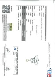 pendente in platino a forma di fiocco impreziosito da un diamante taglio antico di ct 0.20 circa e rose di diamante, da cui pende una perla a goccia naturale di mm 11.6x10.3x8.7 circa, dim. pendente cm 4x5 circa, lungh. collana cm 46, gr. 10. Corredato di certificato LMHC del 20/03/2017 attestante le caratteristiche.