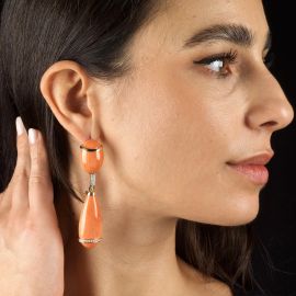 PAIO DI GRANDI ORECCHINI PENDENTI IN CORALLO CON DIAMANTI