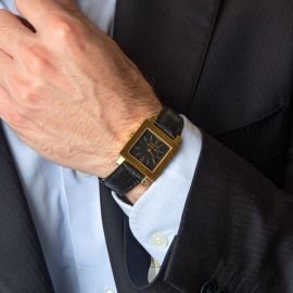 cassa di forma in oro giallo 18kt, fondello serrato con viti, lunetta liscia in oro giallo, quadrante nero, grafica oro, indici applicati di colore oro, datario a ore tre, movimento a carica automatica, cinturino in pelle nera non originale, fibbia firmata Bulgari in oro giallo 18kt, vetro minerale, gr. 62. Dim. mm 29x29