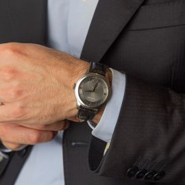 cassa in acciaio, fondello serrato con viti con movimento a vista, corona marcata, lunetta in acciaio, quadrante antracite, grafica bianca, indici e numeri arabi applicati di color argento, secondi e datario a ore sei, movimento a carica automatica n. 108118, cinturino originale in pelle nera, fibbia in acciaio marcata Chopard, vetro minerale. Diam. mm 40