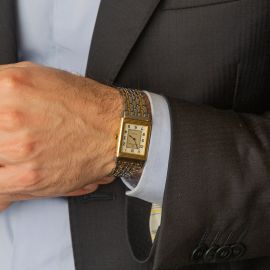 cassa di forma rettangolare in oro giallo con sistema a scorrimento e alloggio in acciaio, corona marcata, quadrante argenté, grafica di colore nero, numeri arabi stampati, movimento a carica manuale, bracciale a maglie in acciaio e oro, lungh. interna cm 19, chiusura doppia deployant in acciaio marcata Jaeger LeCoultre, vetro minerale, gr. 82. Dim. mm 23x38.