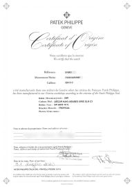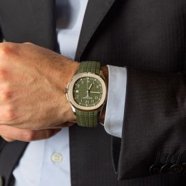 cassa monoblocco in oro bianco 18kt, fondello con movimento a vista, ghiera liscia in oro bianco 18kt, quadrante "Grand Tapisserie" di color kaki, grafica bianca, numeri arabi e indici applicati al superluminova, datario a ore tre, movimento a carica automatica cal 324 SC n. 7332232, cinturino in gomma kaki, lungh. interna cm 19, chiusura doppia deployant marcata Patek Philippe, vetro minerale, gr. 127. Diam. mm 42. Corredato di scatola e garanzia.