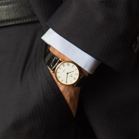 cassa in oro giallo 18kt, fondello a pressione, corona marcata, lunetta liscia in oro giallo 18kt, quadrante bianco, numeri romani applicati, movimento a carica manuale cal 1602, cinturino in pelle nera lucida, fibbia in oro giallo 18kt marcata Rolex, vetro minerale, gr. 35. Diam. mm 32.