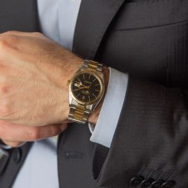 cassa in acciaio, fondello serrato a vite, ghiera zigrinata in oro giallo, corona marcata, quadrante nero, grafica oro, indici oro applicati con trizio, datario a ore tre con lente cyclope, movimento a carica automatica cal 3035 n. 0020515, bracciale oyster in acciaio e oro ref. 78363 finali 458 J, chiusura a scatoletta in acciaio marcata Rolex, vetro plastica, gr. complessivi 105. Diam. mm 36
