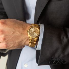 cassa in oro giallo 18kt, fondello serrato a vite recante incisione "Asprey", corona marcata, ghiera in oro giallo satinato bark finish, quadrante argenté recante personalizzazione con la firma del Sultano dell'Oman Qaboos bin Said al Said, grafica nera, indici applicati con trizio, finestra con il giorno della settimana in inglese a ore dodici, movimento a carica automatica cal 1556 n. DD656440, bracciale president a maglie piene in oro giallo 18kt satinato e ad effetto corteccia, finali 53, lungh. interna cm 20, chiusura a scatoletta marcata Rolex, vetro plastica, gr. 121. Diam. mm 36. Corredato di scatola, controscatola, garanzia, libretto e fazzoletto.