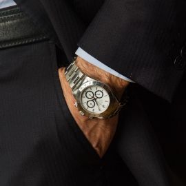 cassa in acciaio, fondello serrato a vite, ghiera in acciaio con scala tachimetrica, tasti del crono a vite e corona marcata, quadrante bianco "sei rovesciato", grafica nera, indici applicati al trizio, contatore dei secondi a ore nove, contatore dei minuti a ore tre, contatore delle ore alle sei, movimento a carica automatica cal 4030 n. 92949, bracciale oyster in acciaio ref. 78390 finali 503B, lungh. interna cm 20, cod. produzione W 4, chiusura a scatoletta in acciaio marcata Rolex, vetro minerale. Diam. mm 40. Corredato di scatola e garanzia.