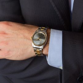 cassa in acciaio, fondello serrato a vite, corona marcata, ghiera zigrinata in oro giallo, quadrante antracite, grafica oro, indici applicati, movimento a carica automatica cal 1530, bracciale oyster in acciaio e oroa maglie rivettate, lungh. interna cm 19, chiusura a scatoletta marcata Rolex, vetro plastica, gr. 70. Diam. mm 34