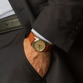 cassa in acciaio, fondello serrato a vite, corona marcata, lunetta liscia in acciaio, quadrante argenté, grafica nera, indici applicati, datario roulette a ore tre con lente cyclope, movimento a carica manuale cal 1215 n. N88061, cinturino non originale in pelle marrone, fibbia in acciaio, vetro plastica. Diam. mm 34