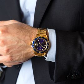 cassa in oro giallo 18kt, fondello serrato a vite, corona marcata, ghiera girevole con inserto blu, quadrante blu, grafica oro, indici bicchierini al trizio, datario a ore tre con lente cyclope, movimento a carica automatica cal 3135 n. 5997225, bracciale oyster a maglie piene in oro giallo 18kt ref. 92908 finali 46B cod. produzione P10, lungh. interna cm 20, chiusura a scatoletta marcata Rolex, vetro minerale, gr. 173. Diam. mm 40
