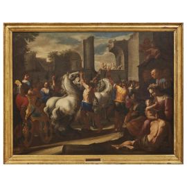 Palesemente ispirato all’antichità classica, il soggetto rimanda in ogni caso all’importante, e a Napoli relativamente inusuale, revival della storia antica che nella seconda metà degli anni Trenta ha la sua massima espressione nel ciclo di storie romane commissionate dal Vicerè spagnolo, il conte di Monterrey, per il palazzo del Buen Retiro a un gruppo di artisti tra Roma e Napoli, tra cui per l’appunto Aniello Falcone e Micco Spadaro.