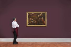 Comparso per la prima volta a Milano nel 2005 e in quell’occasione attribuito al pittore bavarese, il bel dipinto qui presentato differisce in certa misura dalle opere più note del suo periodo italiano per maggiore ampiezza e monumentalità delle figure che lo compongono, più vicine agli esempi di un Agostino Beltrano – richiamato anche nel tendaggio cremisi fissato ai rami, quasi un rustico baldacchino – o di Antonio De Bellis, che non alle figurette spiritate di Micco Spadaro.